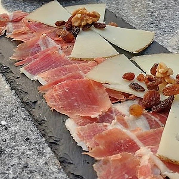 Tostadas del salmón y aguacate, un variedad de jamones y excelentes vinos españoles.